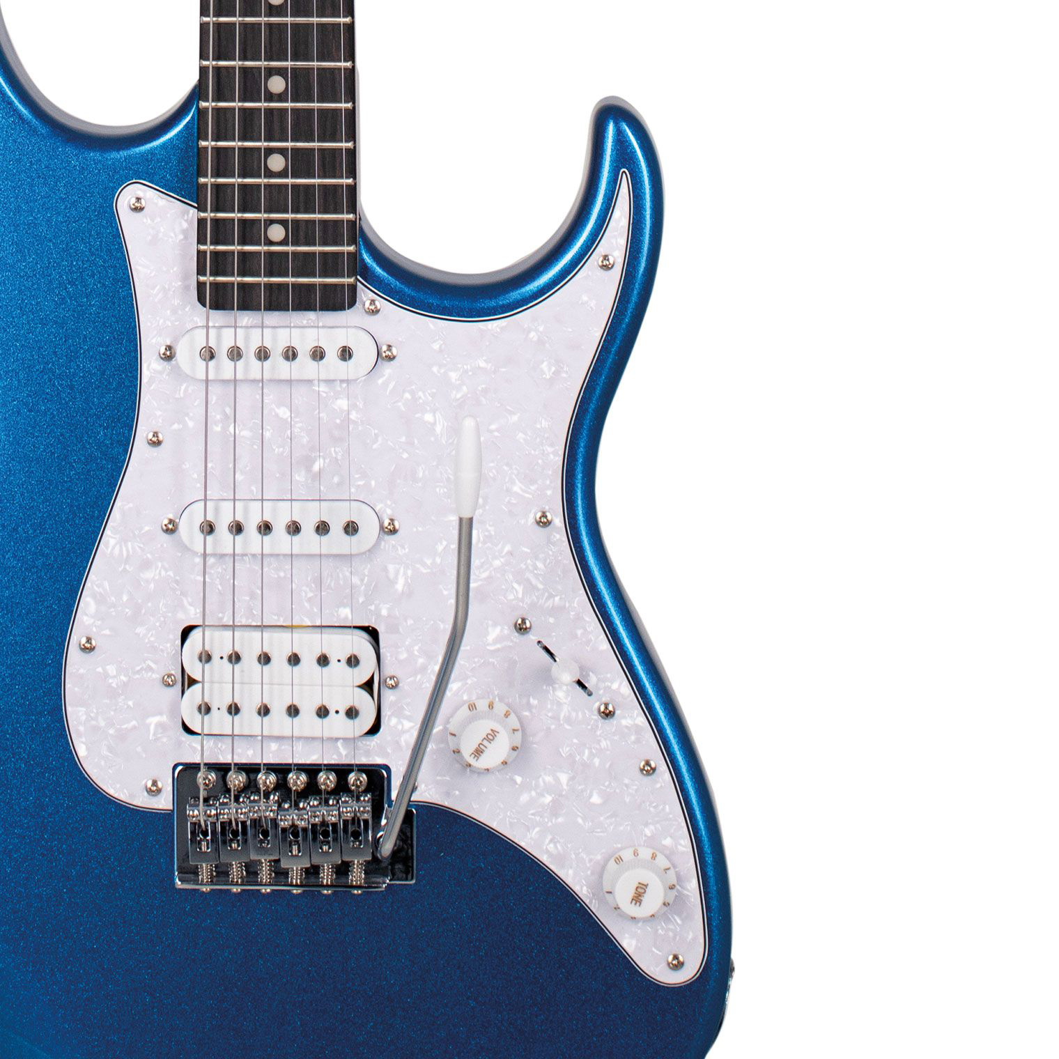O acabamento azul metálico, somado ao escudo Pearloid (Perolado) e à escala escura, confere um visual refinado que remete a guitarras de alto padrão, tornando-a uma das favoritas tanto para iniciantes exigentes quanto para músicos que já atuam na noite.