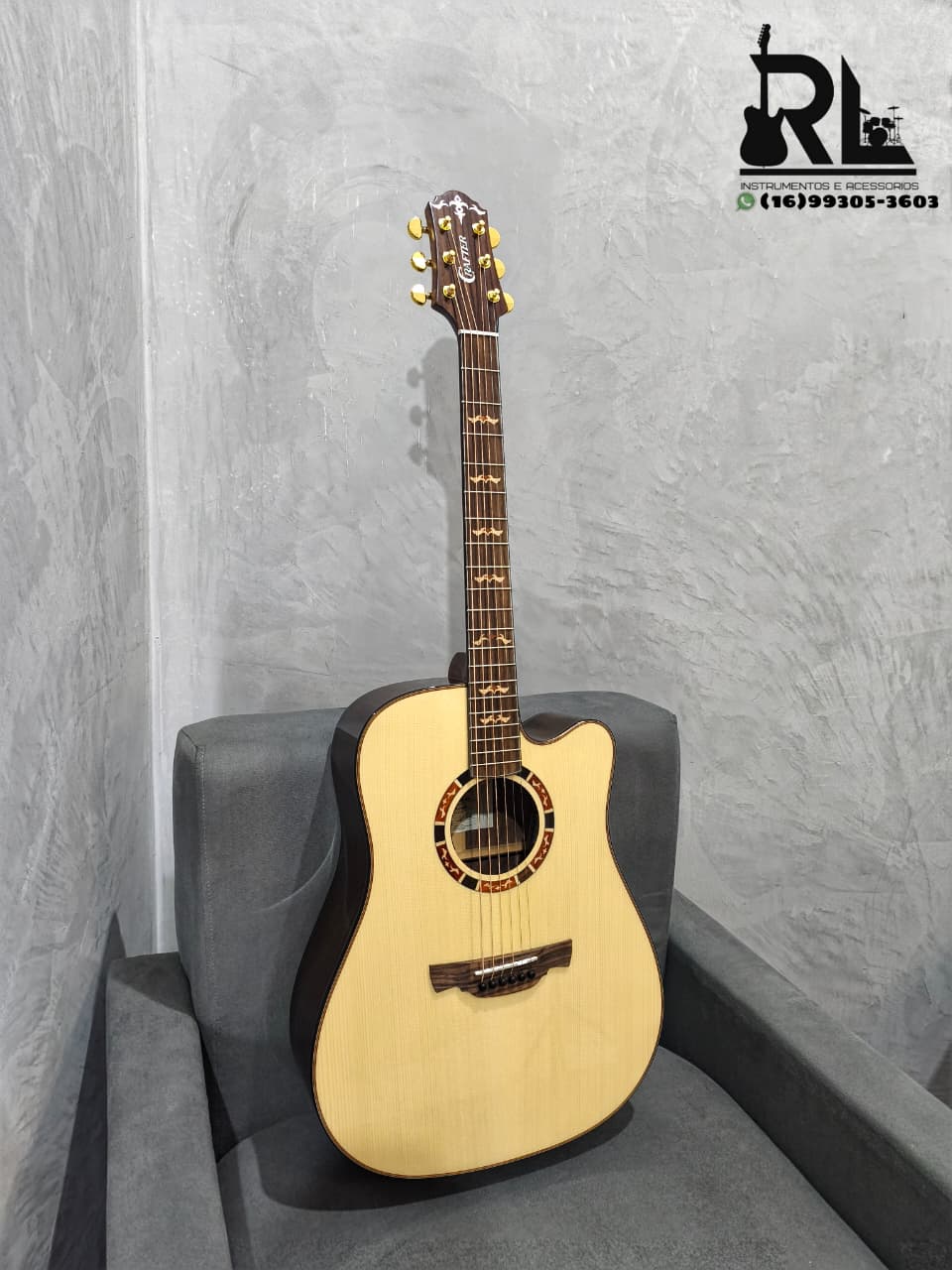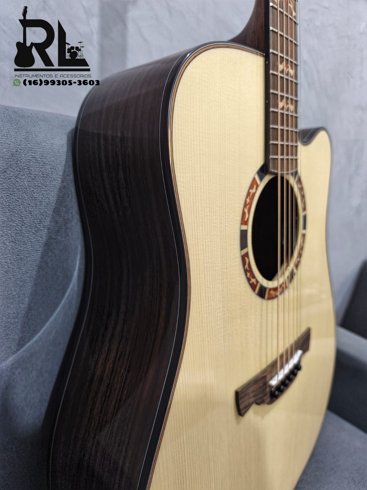 Madeiras de Alta Qualidade: Spruce Maciço e Rosewood Laminado O STG D-20CE Pro+ é um exemplo clássico da qualidade Crafter. Seu tampo é feito de Spruce maciço, uma madeira reconhecida por sua excelente projeção sonora e clareza tonal. O Spruce proporciona uma resposta rápida e precisa, com agudos brilhantes e médios bem definidos, ideal para estilos que demandam articulação clara e distinta. As laterais e o fundo são de Rosewood laminado, conhecido por sua profundidade sonora e ressonância.