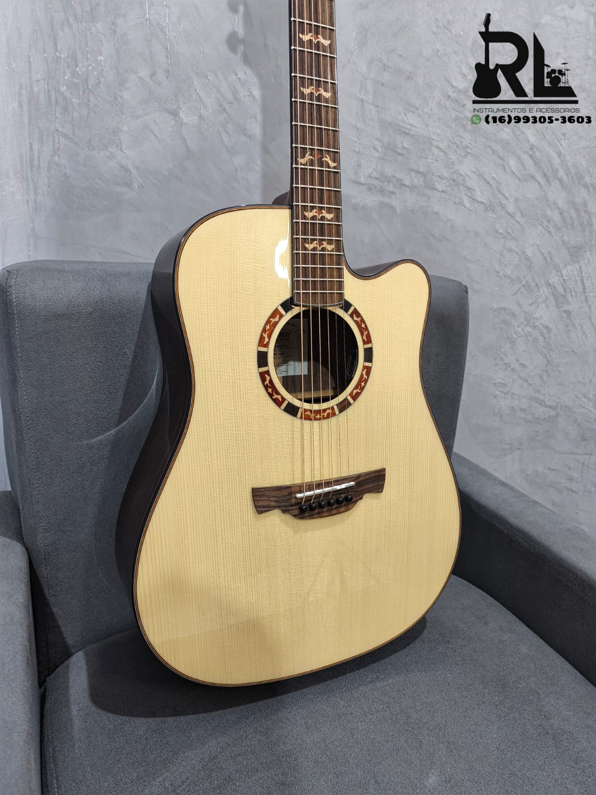 Modelo: STG D-20ce Pro – Formato: Folk Cutway – Tampo: Spruce Maciço – Lateral: Rosewood Laminado – Fundo: Rosewood Laminado – Braço: Mahogany – Escala e cavalete: Rosewood – Roseta: Wood Elegant – Marcação da escala: Wood Elegant – Tarraxas: Douradas Blindadas Deluxe – Captação: DS-2 Pro+ com Afinador Stealth – Escala: 647.7mm / 25,5’ – Cor: Natural – Acabamento: Brilhante