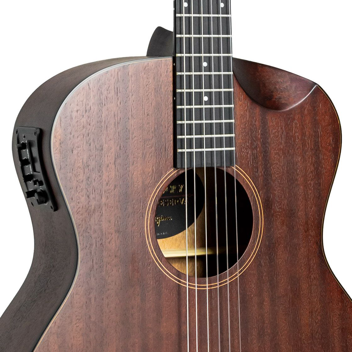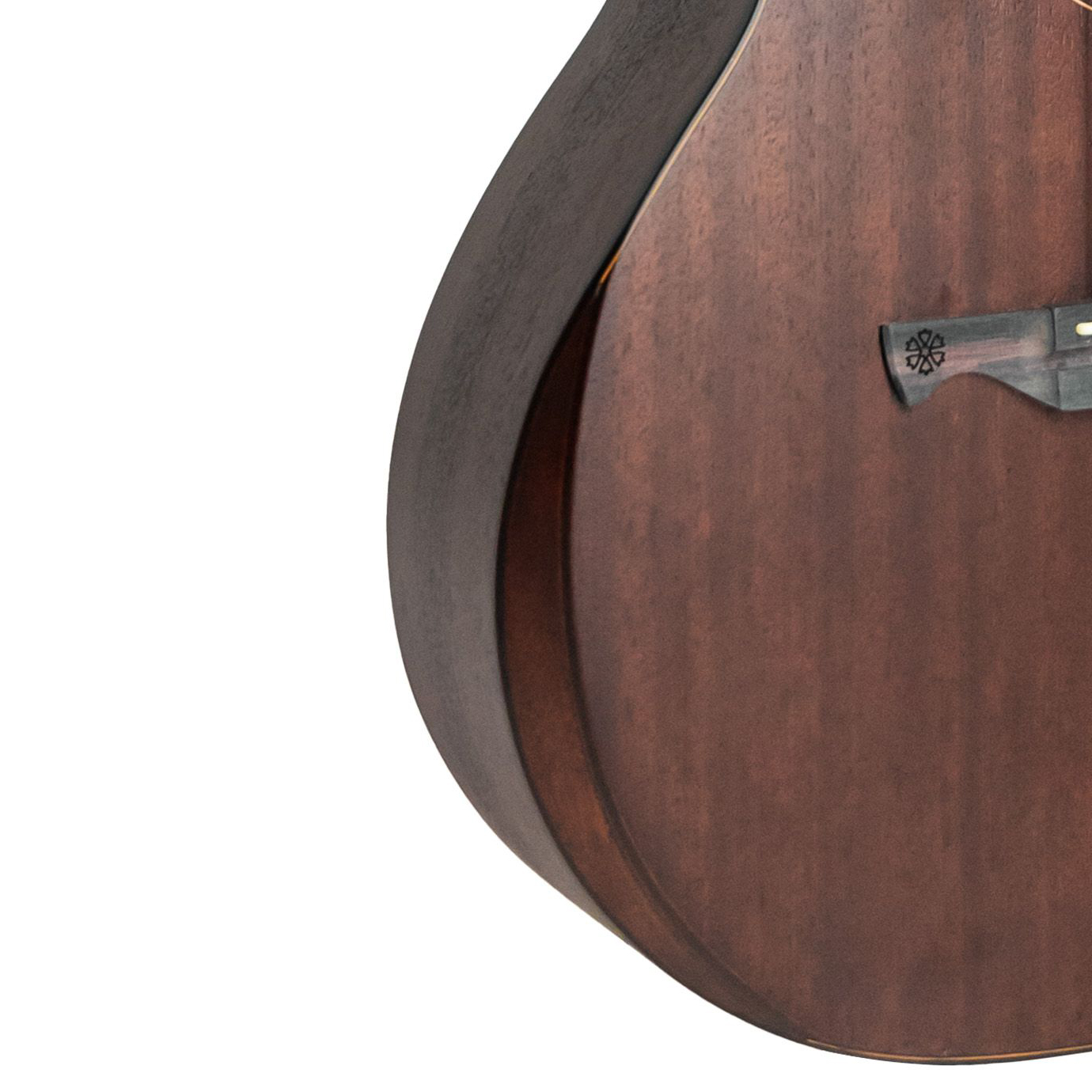 O acabamento Dark Mahogany Open Pore (DKMOP) permite que você sinta a textura real da madeira, além de favorecer a ressonância natural do corpo, já que o verniz ultra fino não “abafa” a vibração das fibras.
