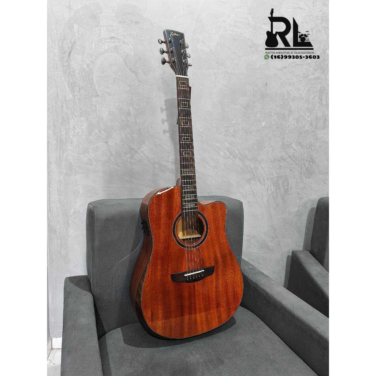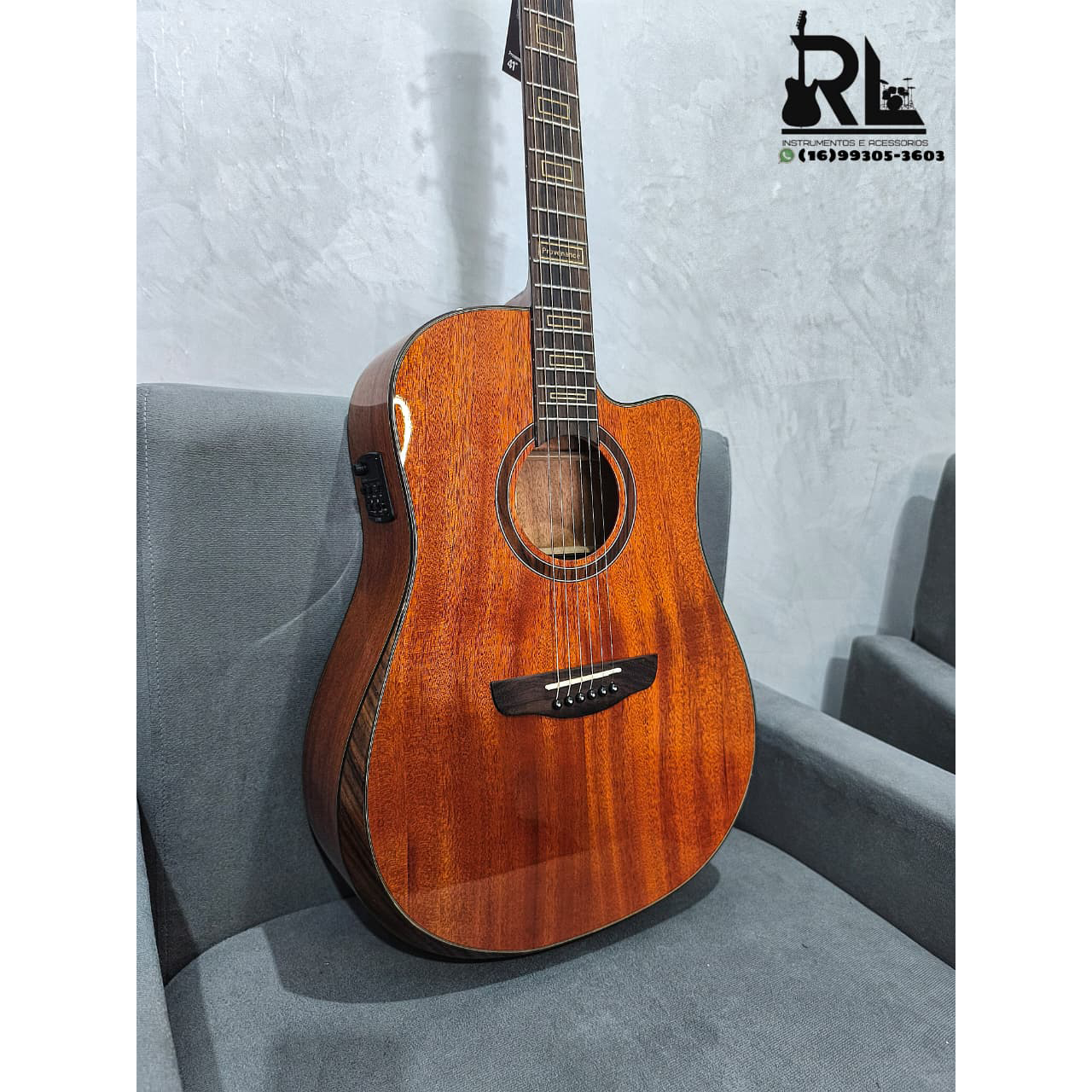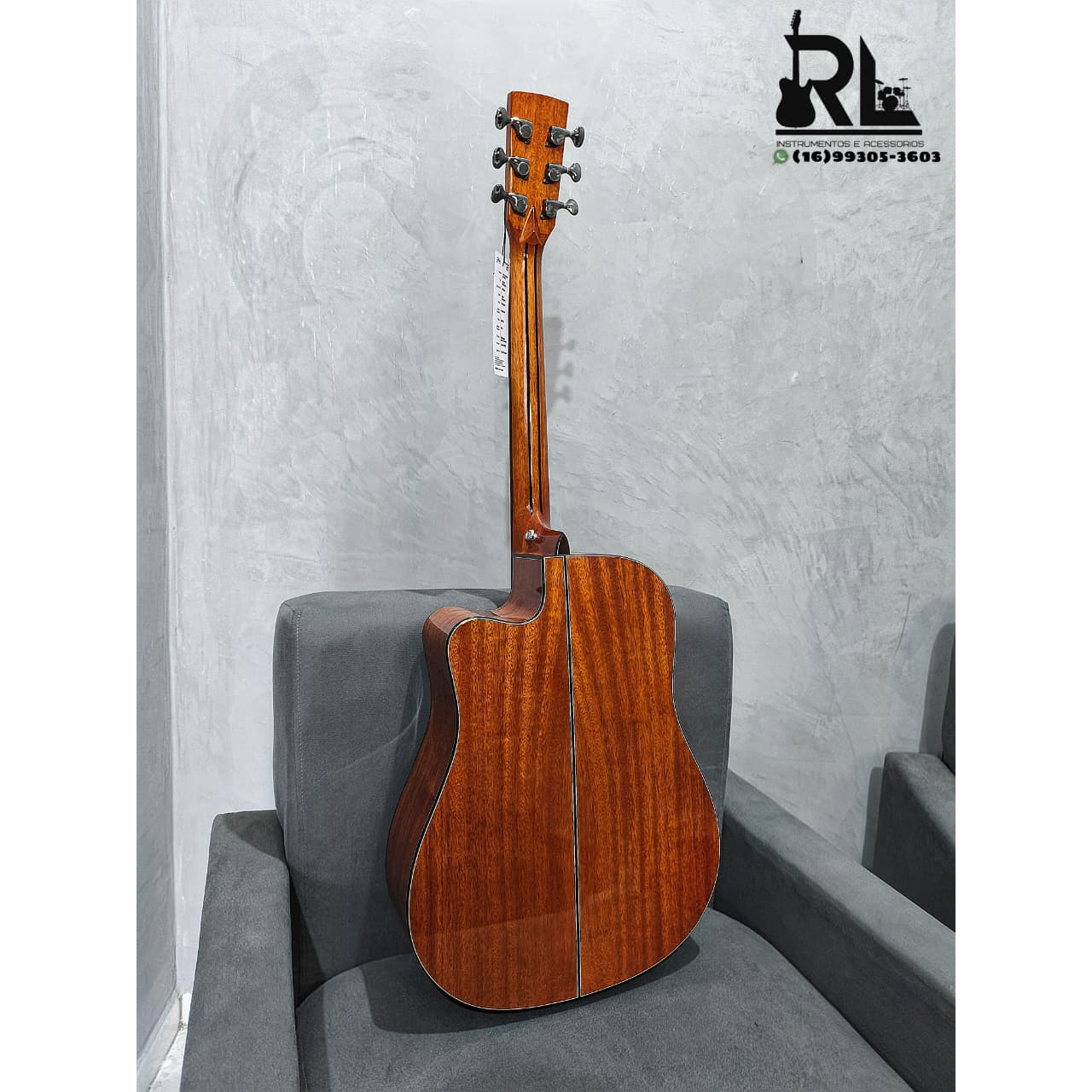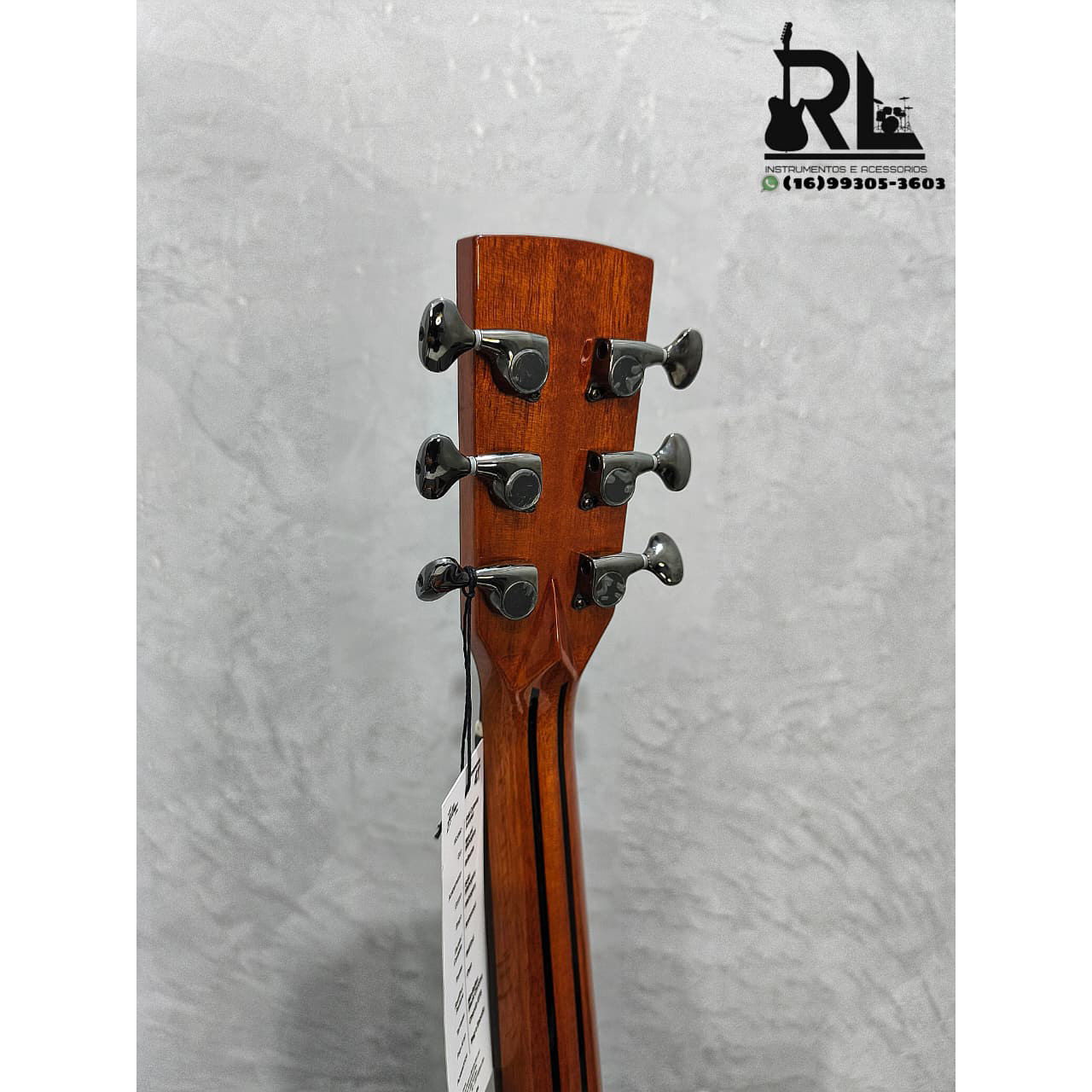 - Corpo em Mahogany: O fundo, as laterais e, possivelmente, o tampo em Mahogany (Mogno) são o grande diferencial. Essa madeira confere um timbre quente, aveludado e com excelente ressonância, que é ideal para o blues, folk, fingerstyle e baladas.