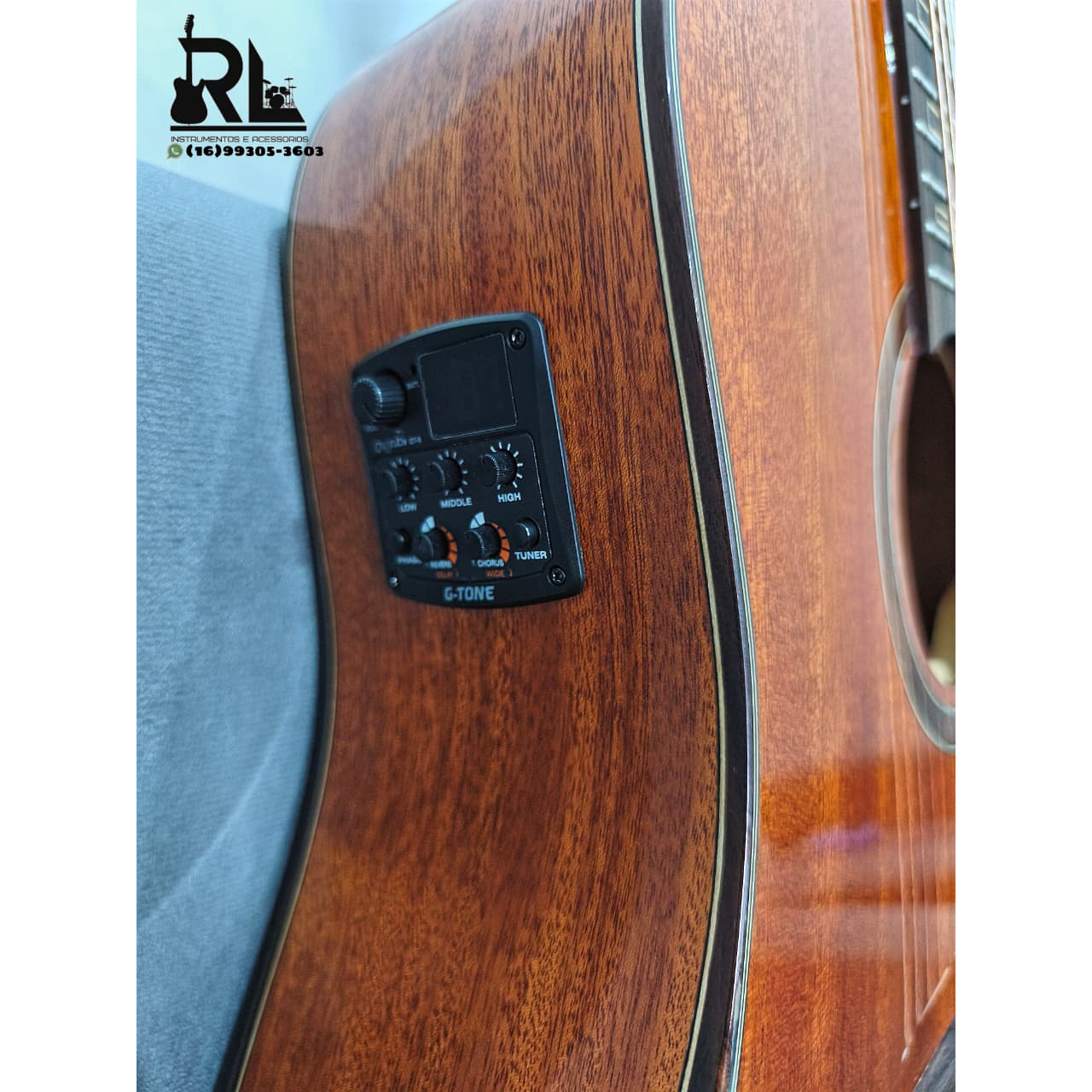 - Sistema Eletroacústico com Efeitos: O pré-amplificador de bordo (não especificado, mas implícito) vai além do simples controle de volume e equalização. Ele conta com EFEITOS EMBUTIDOS (como Reverb e/ou Chorus). Isso permite que você adicione profundidade e ambiência ao seu som diretamente no violão, eliminando a necessidade de pedais externos.